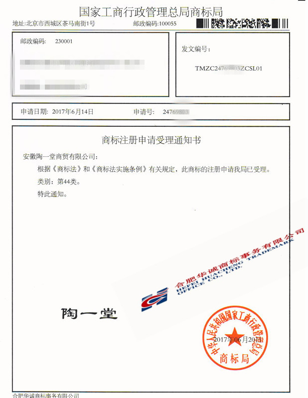 您委托我所代理商标注册申请,名称为“陶一堂”44类商标已被国家商标局受理。
