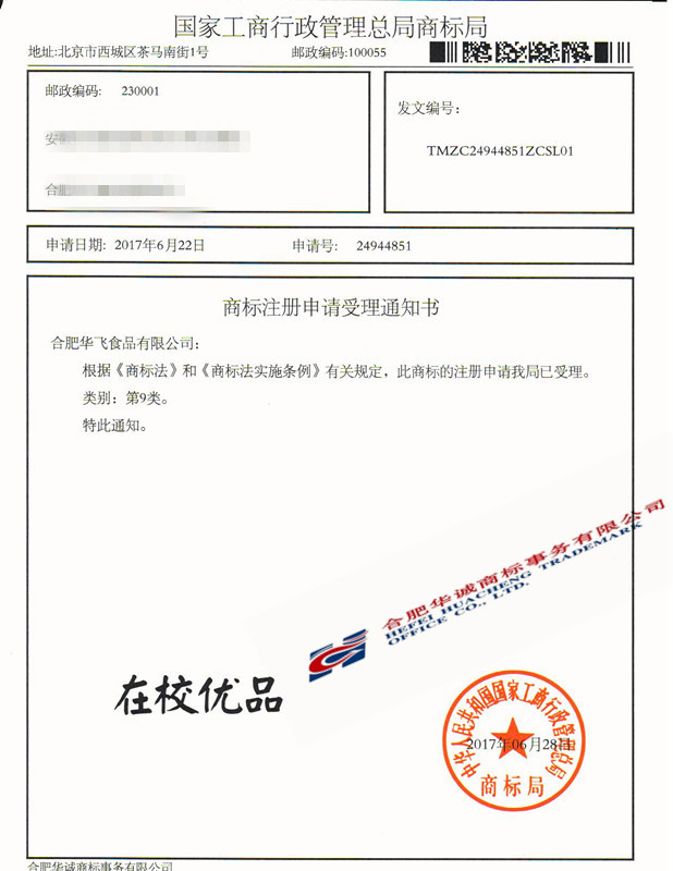 您委托我所代理商标注册申请,名称为“在校优品”9类商标已被国家商标局受理。