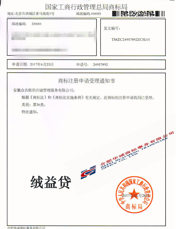 您委托我所代理商标注册申请,名称为“绒益贷”36类商标已被国家商标局受理。