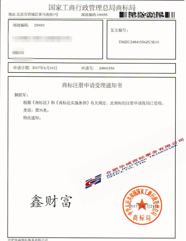 您委托我所代理商标注册申请,名称为“鑫财富”35类商标已被国家商标局受理。