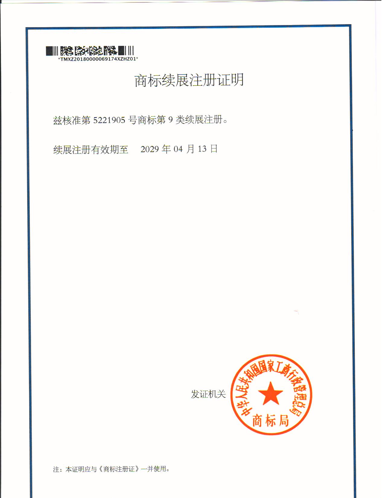 您委托我所代理商标注册申请,第“5221905”29类商标续展注册证明已下达。