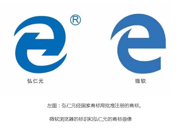 经过分析鉴别,弘仁元公司认为,微软最新浏览器使用的图标与公司的商标图案相近似,且使用在与公司注册商标核定使用的42类相同的服务类别上,会导致互联网与软件等行业内的普通消费者混淆。